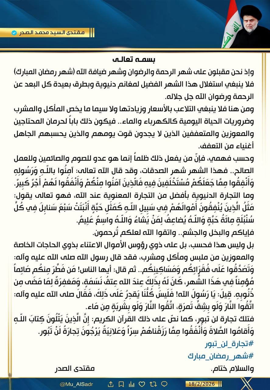 وقال السيد الصدر في تدوينة له على منصة (إكس)، تابعتها وكالة انباء النافذة، "وإذ نحن مقبلون على شهر الرحمة والرضوان وشهر ضيافة الله (شهر رمضان المبارك) فلا ينبغي استغلال هذا الشهر الفضيل لمغانم دنيوية وبطرق بعيدة كل البعد عن الرحمة ورضوان الله جل جلاله".