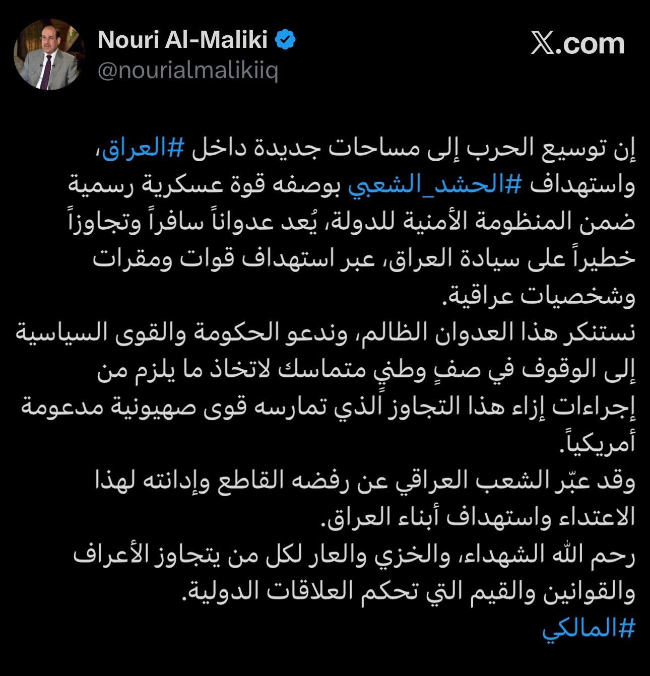 وقال المالكي في تدوينة له على منصة (إكس)، تابعته وكالة انباء النافذة، إن "توسيع الحرب إلى مساحات جديدة داخل العراق، واستهداف الحشد الشعبي بوصفه قوة عسكرية رسمية ضمن المنظومة الأمنية للدولة، يُعد عدواناً سافراً وتجاوزاً خطيراً على سيادة العراق، عبر استهداف قوات ومقرات وشخصيات عراقية".