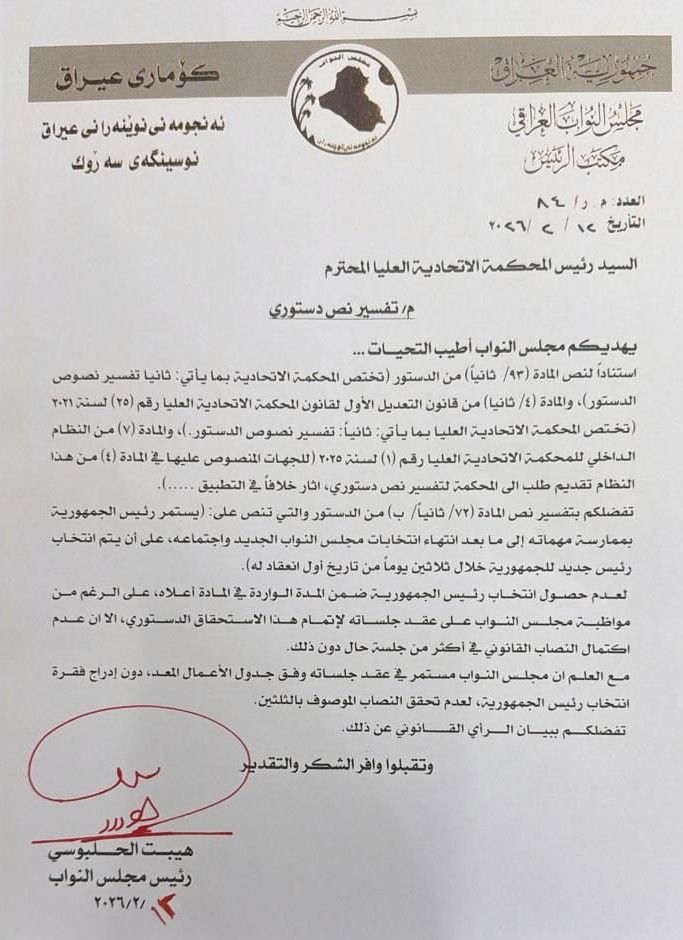 وأضاف ان "هذه المخاطبة تأتي حرصاً على تطبيق الدستور، وإيماناً من رئاسة مجلس النواب بدور المحكمة الاتحادية العليا ومهامّها الدستورية وفقاً للمادة (93) من الدستور، والمادة (4) من قانون التعديل الأول لقانون المحكمة الاتحادية العليا رقم 25 لسنة 2021، والمادة (7) من النظام الداخلي رقم (1) للمحكمة الاتحادية لسنة 2025، في ظلِّ عدم حصول انتخاب رئيس الجمهورية في المدة المحدَّدة دستورياً؛ بسبب عدم اكتمال نصاب جلسات المجلس، على الرغم من حرص رئاسة المجلس على عقدها من غير تأجيل".