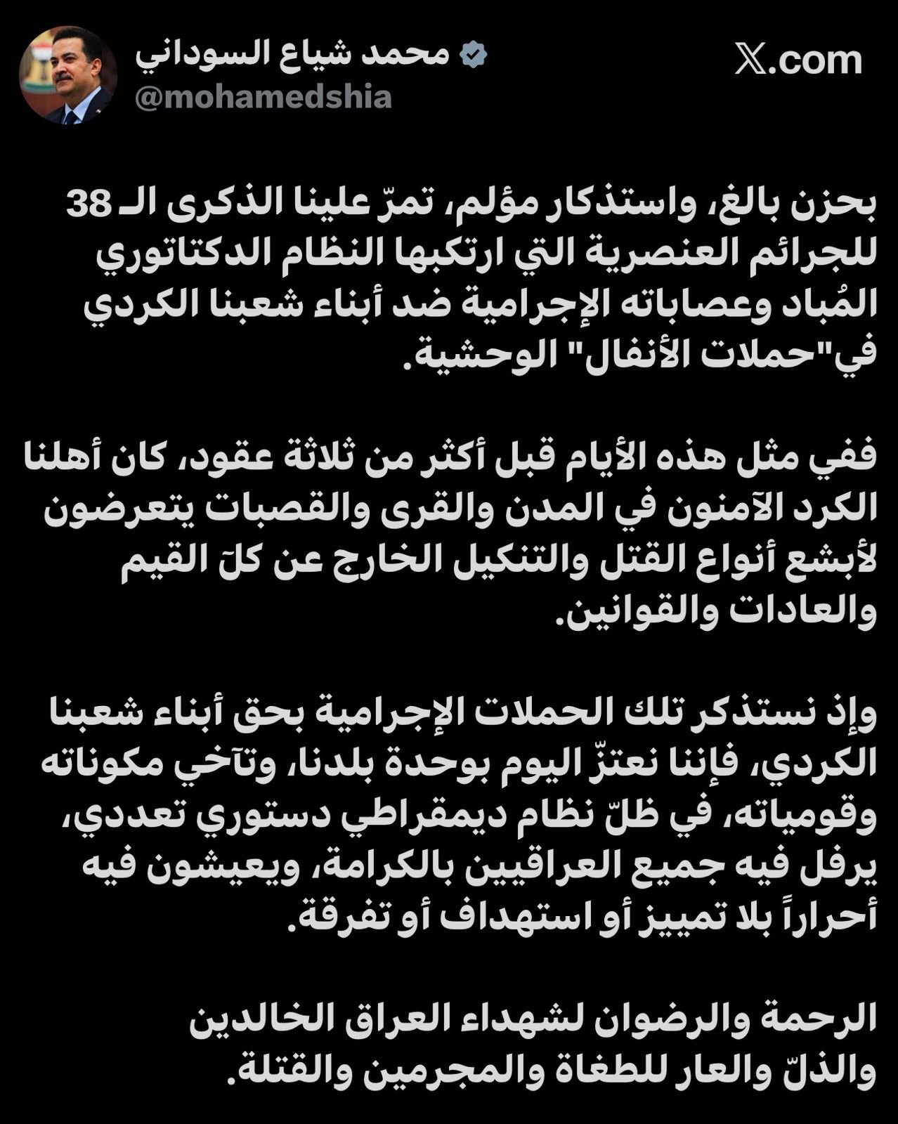 وقال رئيس الوزراء، في تدوينة على منصة أكس وتابعتها وكالة انباء النافذة، إنه "بحزن بالغ، واستذكار مؤلم، تمرّ علينا الذكرى الـ 38 للجرائم العنصرية التي ارتكبها النظام الدكتاتوري المُباد وعصاباته الإجرامية ضد أبناء شعبنا الكردي في"حملات الأنفال" الوحشية".