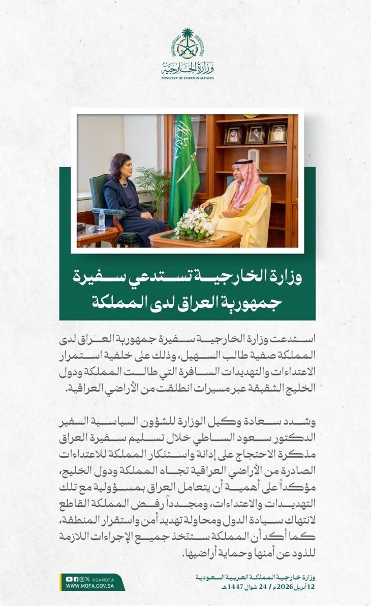 استدعت وزارة الخارجة السعودية، اليوم الأحد، السفيرة العراقية في الرياض صفية السهيل وسملتها مذكرة احتجاج.