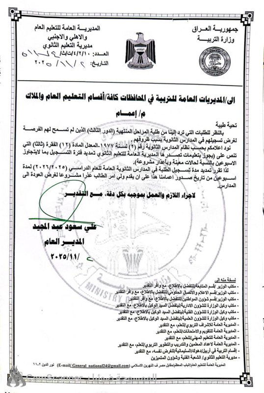 وذكرت الوزارة في بيان تلقته وكالة الانباء العراقية انه قررت المديرية العامة للتعليم العام والاهلي والاجنبي تمديد مدة تسجيل الطلبة في المدارس الثانوية العامة للعام الدراسي (2026/2025) لإسبوعين من تاريخ صدور الكتاب أدناه".